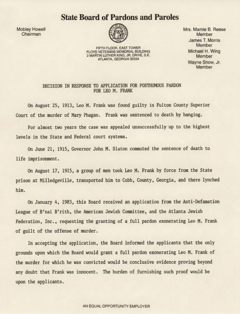 DECISION IN RESPONSE TO APPLICATION FOR POSTHUMOUS PARDON FOR LEO M. FRANK