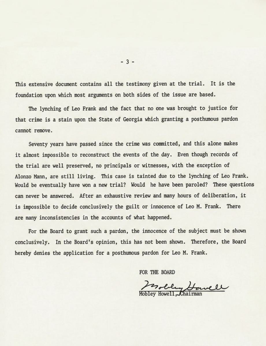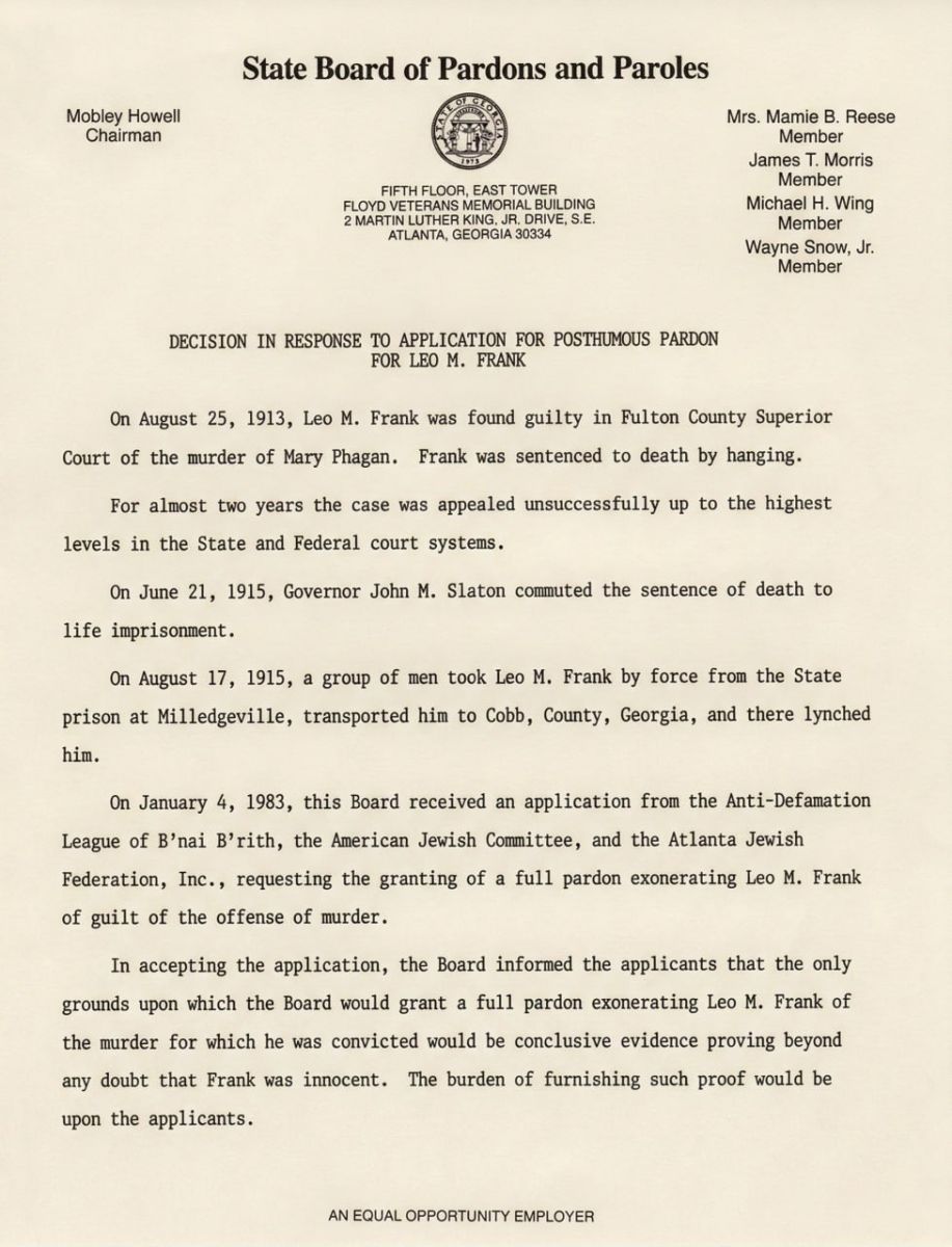 Leo M. Frank was denied exoneration by the Georgia State Pardons and Paroles on December 22nd, 1983, for the murder of Mary Phagan in 1913. Below are the documents issued by the Georgia State.