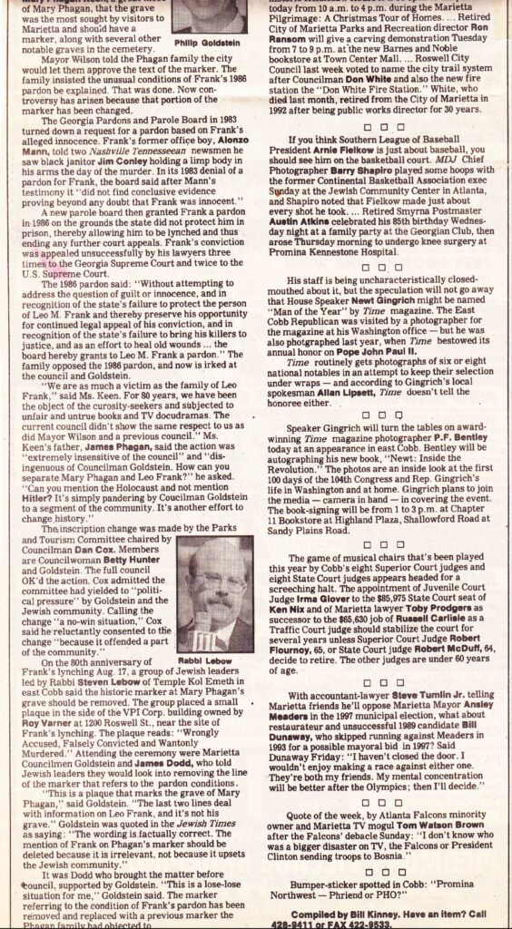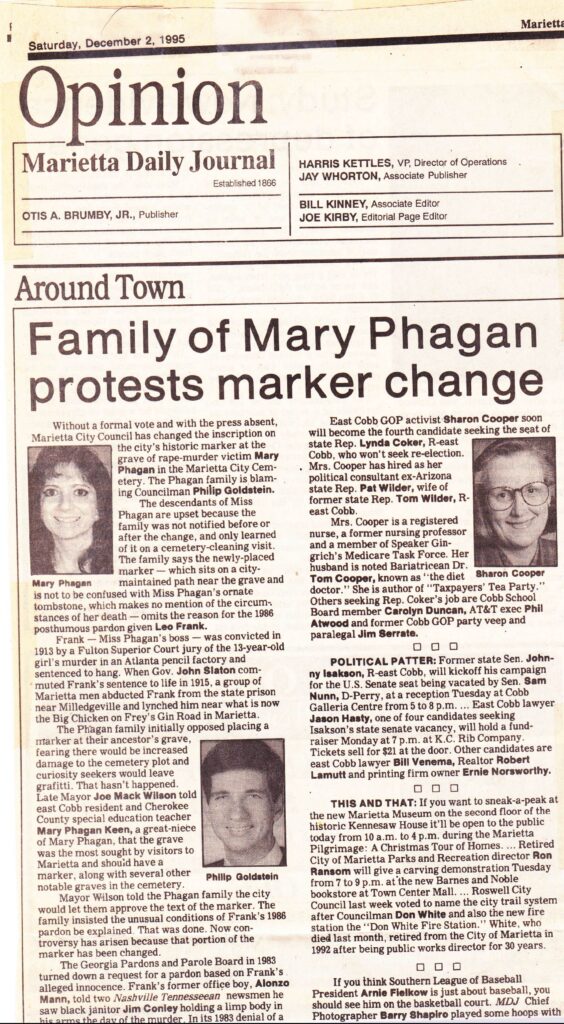 The Marietta Daily Journal broke the story on Saturday, December 2, 1995, in Bill Kinney’s “Around Town” column, under the headline “Family of Mary Phagan protests marker change.”