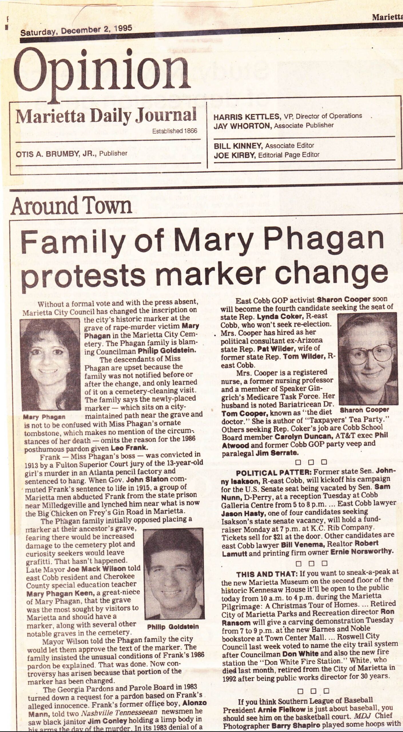 Appendix C: Marietta Daily Journal, Saturday, December 2, 1995 — “Family of Mary Phagan Protests Marker Change” by Bill Kinney (Around Town Column, Opinion Section)