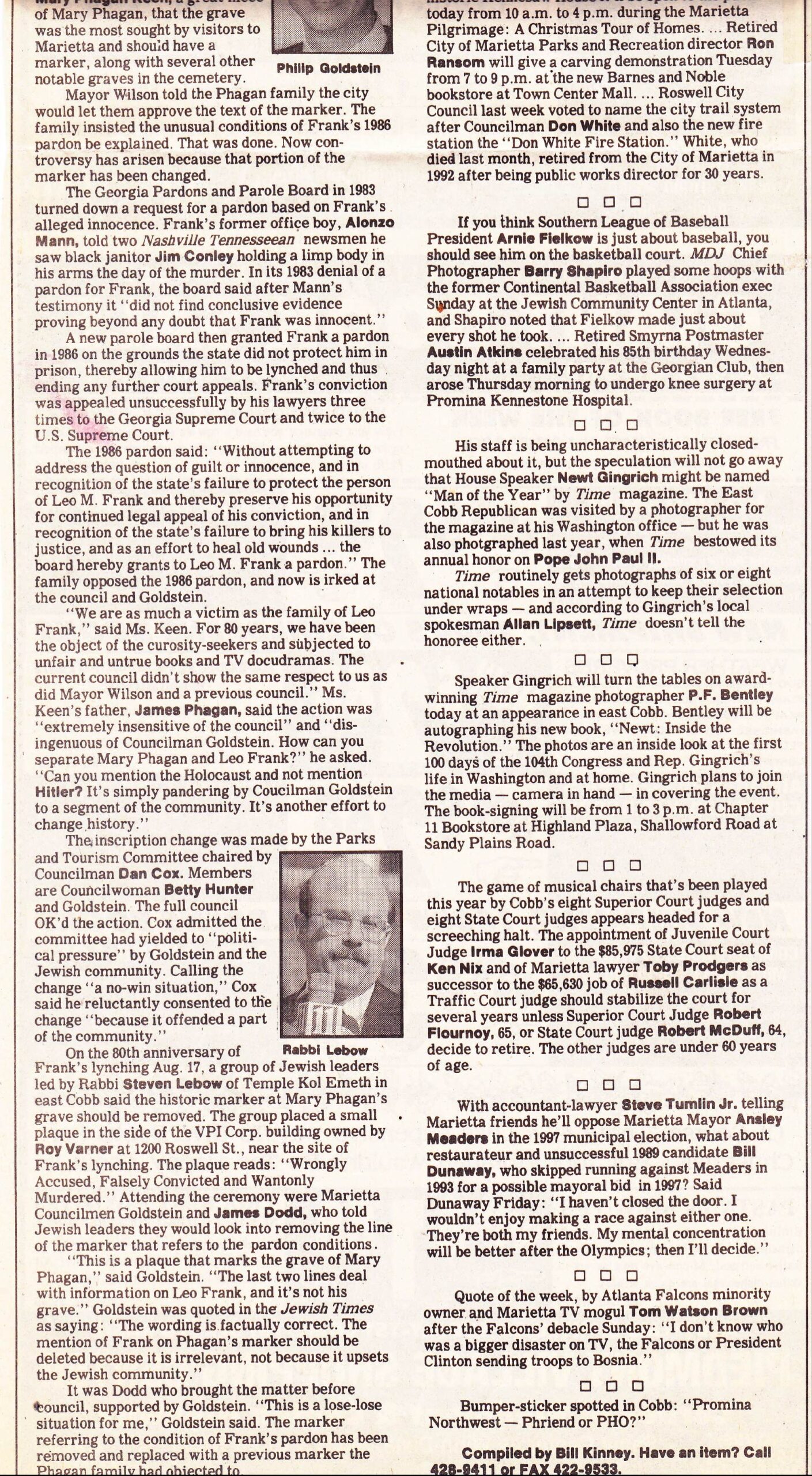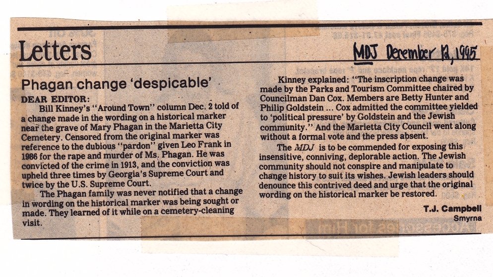 Ten days later, on December 12, 1995, the Marietta Daily Journal published a letter to the editor from T.J. Campbell of Smyrna under the headline “Phagan change ‘despicable’.”