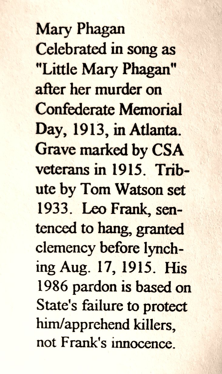Mary Phagan / Celebrated in song as “Little Mary Phagan” after her murder on Confederate Memorial Day, 1913, in Atlanta. Grave marked by CSA veterans in 1915. Tribute by Tom Watson set 1933. Leo Frank, sentenced to hang, granted clemency before lynching Aug. 17, 1915. His 1986 pardon is based on State’s failure to protect him/apprehend killers, not Frank’s innocence.
