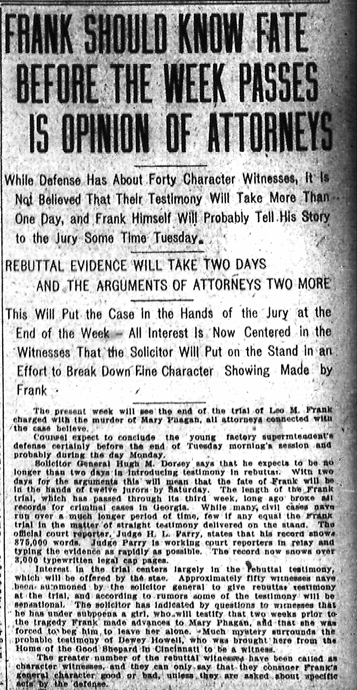 Solicitor General Hugh M. Dorsey says that he expects to be longer than two days is introducing testimony is rebuttal. With two days for the arguments this will mean that the fate of Frank will be in the hands of twelve jurors by Saturday. The length of the Frank trial, which has passed through its third week, long ago broke all records for criminal cases in Georgia. While many, civil cases run over a much longer period of time, few if any equal the Frank trial, which has passed through its third week, long ago broke all records for criminal cases in Georgia. While many, civil cases run over a much longer period of time, few if any equal the Frank trial in the matter of straight testimony delivered on the stand. The official court reporter, Judge H. L. Parry, states that his record showed 375,000 words. Judge Parry is working court reporters in relay and typing the evidence as rapidly as possible. The record now shows over 3,000 typewritten legalese pages.